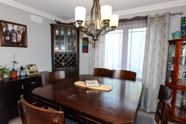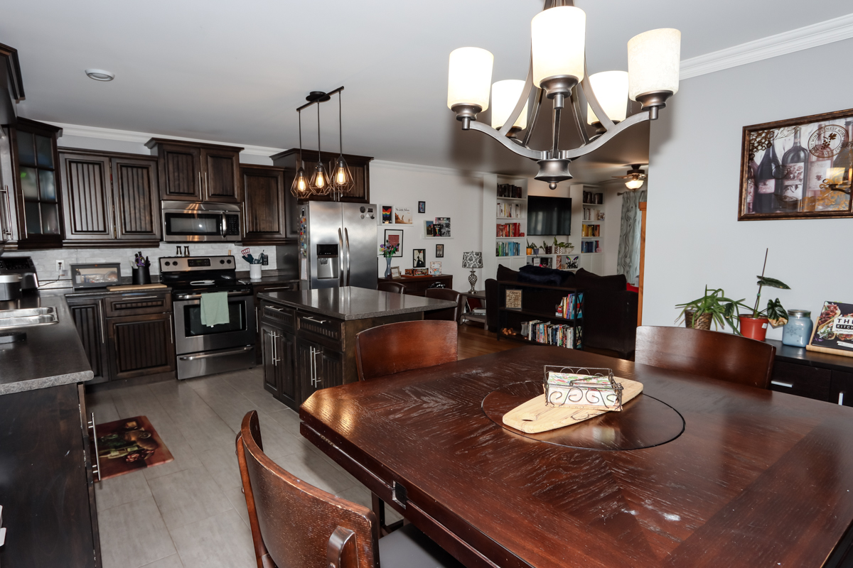 The main level boasts an open-concept layout featuring a bright and spacious living room, a dining area with patio doors leading to a generously sized back deck, and a custom-built kitchen with a center island and built-in server cabinet—perfect for both everyday living and entertaining. A convenient 2-piece powder room completes this level.